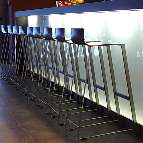 Delicate look of the Airy bar chair is given by the base metal construction with dominant front legs. These are of a rectangle cross-section and are fitted with a shaped tube. They freely move into the back legs. Chair’s seat is made of shaped beech plywood and it is supplemented by two decorative notches. This model looks well when placed into a line in a modern kitchen, restaurant or a bar.